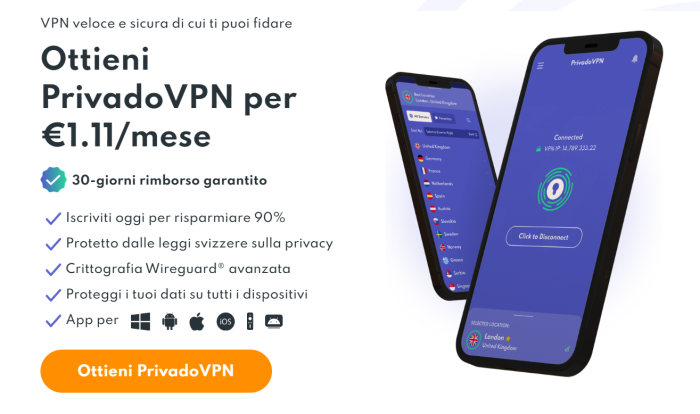 Il piano da due anni è ora disponibile a 1,11 euro al mese grazie a uno sconto del 90%, con tre mesi aggiuntivi inclusi senza costi e una garanzia di rimborso valida 30 giorni dall’attivazione. Ma vediamo nel dettaglio cosa offre PrivadoVPN.