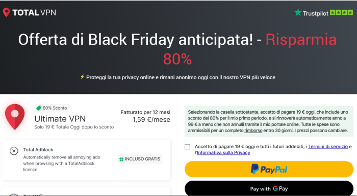 Ribadiamo la promo del momento: 19€ per un anno invece di 99€, cioè 1,59€ al mese. Basta andare sul sito di TotalAV: una volta attivato, non dovrai preoccuparti più di niente.