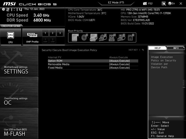 Accedendo al BIOS UEFI delle motherboard MSI è quindi bene portarsi nella sezione Secure Boot, scegliere Image Execution e assicurarsi che le varie opzioni non siano impostate su Always Execute.