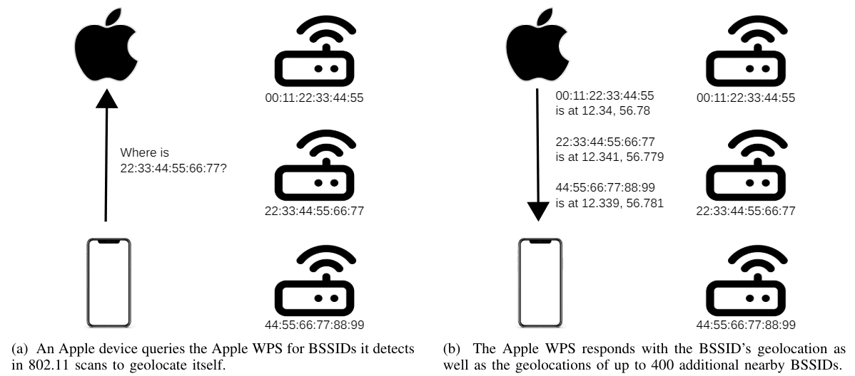 Generando casualmente indirizzi MAC a partire dai prefissi definiti dall’IEEE e interrogando il WPS di Apple, un utente può scoprire quali indirizzi MAC corrispondono ad access point reali e conoscere la loro rispettiva posizione geografica.