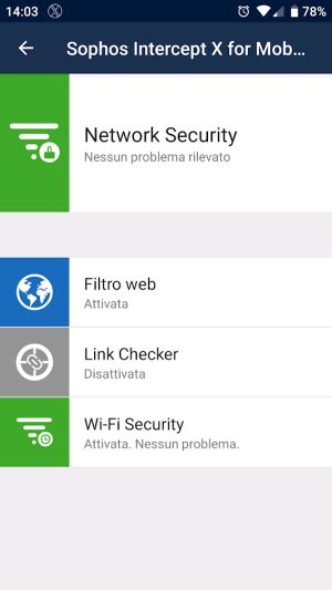 Nella sezione Network Security, Intercept X per Mobile integra alcuni strumenti utili per proteggere la navigazione web, verificare la bontà dei link contenuti in SMS, email e documenti e controllare che l’utente non si colleghi a reti WiFi non sicure.