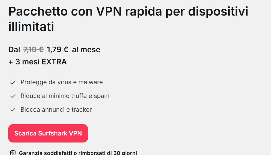 Surfshark rinnova la propria offerta sulla sua VPN pluripremiata: grazie all’87% di sconto attivo su tutti i piani puoi averla a partire da 1,78 euro al mese, con 3 mesi aggiuntivi sul tuo piano e la possibilità di attivare servizi extra come antivirus e ad-blocker allo stesso prezzo. Un’opportunità unica in un mercato estremamente competitivo in cui Surfshark si posiziona, sicuramente, come una delle opzioni più vantaggiose e complete in assoluto.