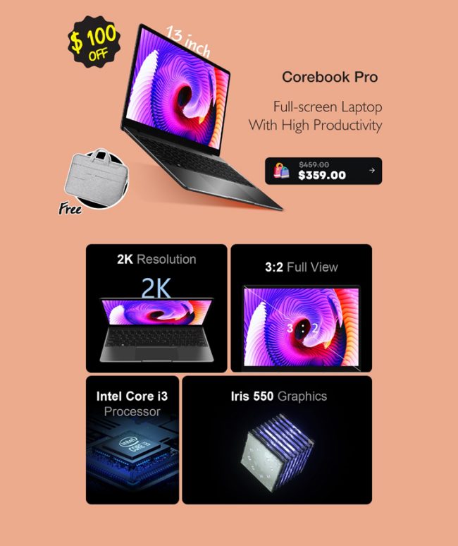 In vista del rientro a scuola Chuwi propone anche il più economico notebook CoreBook Pro che viene proposto in promozione al prezzo speciale di circa 306 euro.
