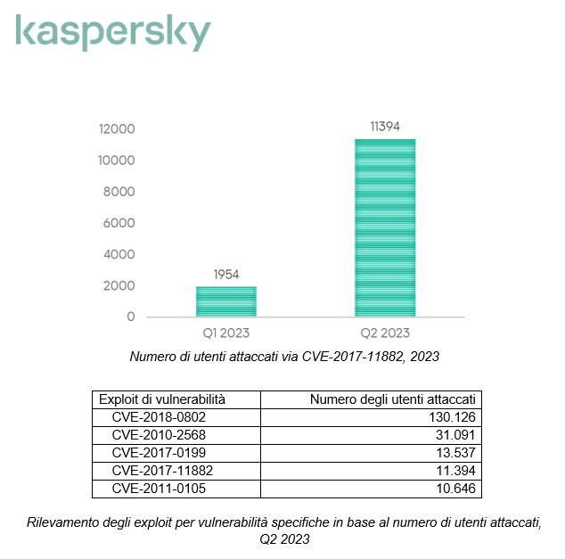 Sebbene le vulnerabilità in questione siano state identificate e corrette da tempo da parte dei tecnici Microsoft, per la falla CVE-2017-11882, nel secondo trimestre 2023 si è registrato un aumento del 483% degli exploit rispetto al primo trimestre di quest’anno.