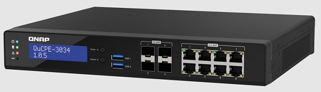 QuCPE-3034 è dotato di un processore Intel Atom Refresh C3758R a otto core, 16 GB di memoria RAM DDR4, otto porte 2,5 GbE RJ-45 e quattro porte in fibra 10 GbE SFP+.