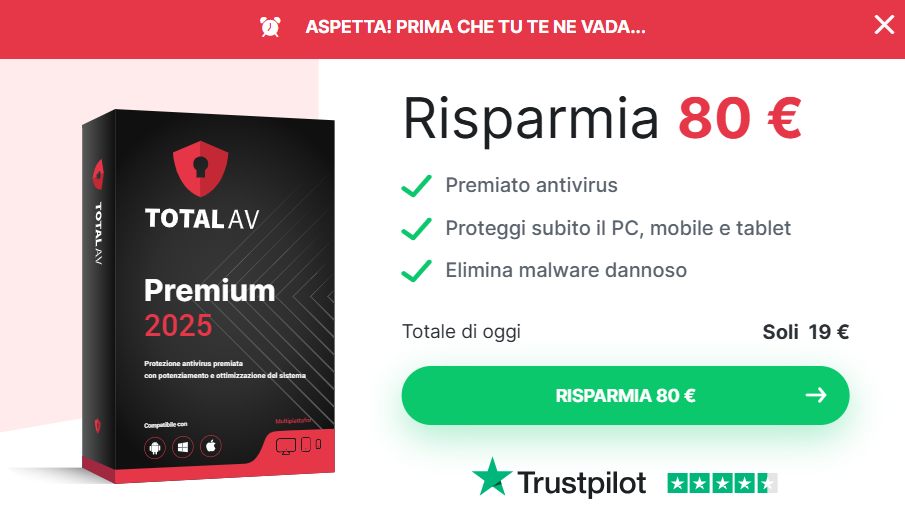 Preparati ad avere un pacchetto di sicurezza completo a un prezzo incredibilmente basso. TotalVPN è in offerta speciale con uno sconto dell’80% per un anno: pagherai solo 19 euro invece di 99 per avere una VPN veloce e sicura accompagnata da Total AdBlock e TotalAV Antivirus inclusi nel prezzo senza costi aggiuntivi.