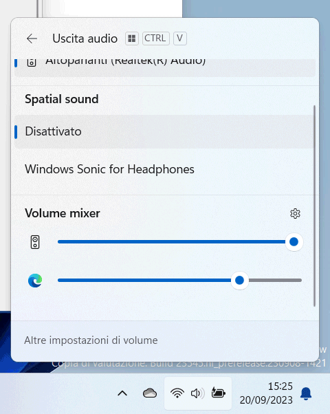 Con un clic sull’icona dell’altoparlante, sempre nella traybar, si accede anche al nuovissimo mixer volume che dà modo di regolare il volume sonoro a livello di intero sistema o di singole applicazioni in esecuzione. La combinazione di tasti Windows+CTRL+V permette di aprire rapidamente il mixer.